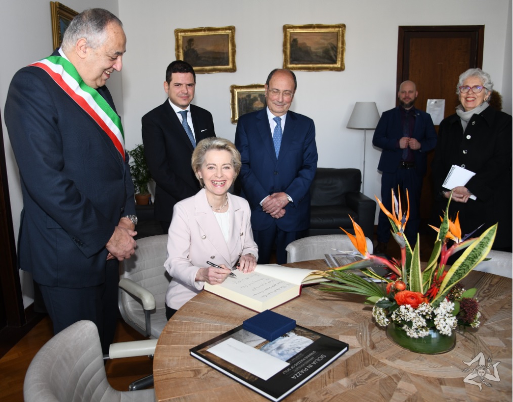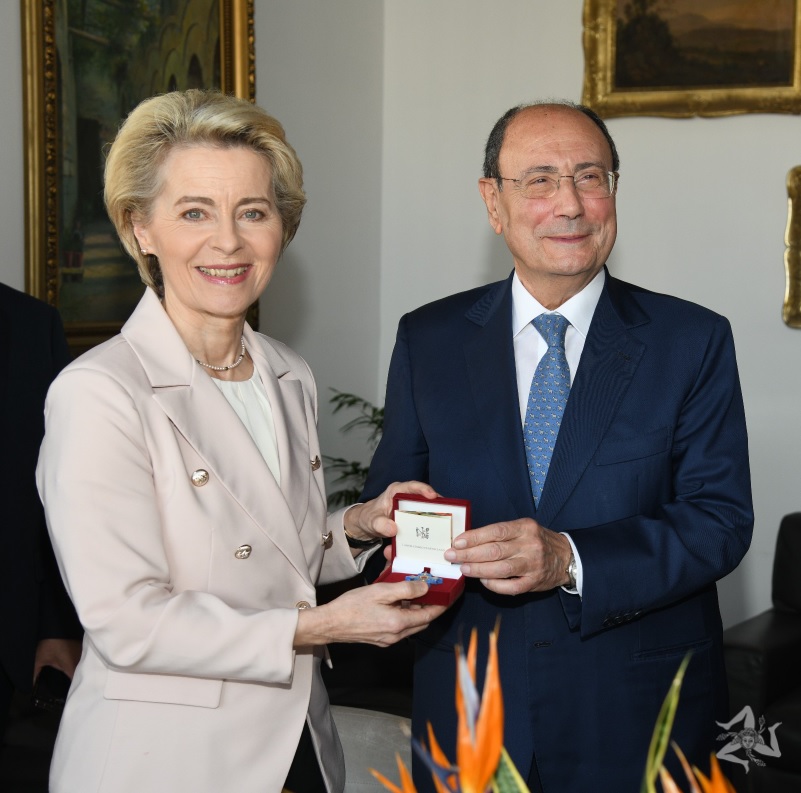 Il presidente dell’Assemblea regionale siciliana, Gaetano Galvagno, ha omaggiato nel corso di un incontro privato la von der Leyen con il libro in lingua inglese “Il Palazzo Reale di Palermo”, testo che racchiude la storia di uno dei luoghi più iconici d’Europa.