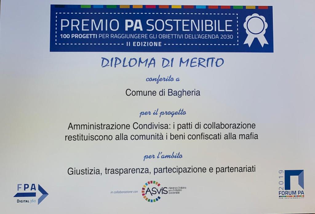 Il Comune di Bagheria con il progetto “Amministrazione condivisa: I patti di collaborazione restituiscono alla comunità i beni confiscati alla mafia” è stato tra i 100 protagonisti, a Roma del “Premio PA sostenibile, 100 progetti per raggiungere gli obiettivi dell’Agenda 2030”, un’iniziativa promossa da FPA (Forum della Pubblica Amministrazione) in collaborazione con ASviS (Alleanza Italiana per lo sviluppo sostenibile) per individuare, far emergere e valorizzare i migliori progetti e prodotti che aiutano la PA nel percorso di crescita sostenibile verso il 2030.