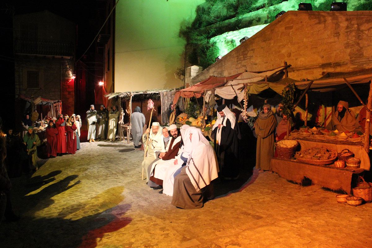 Pastori, mercanti, suonatori, venditori ambulanti, osti, lavandaie, ottomani, giocolieri sembreranno fissati, nei loro gesti quotidiani, come in un incantesimo. Saranno riproposte spaccati della vita sociale della Palestina del tempo, legate alla presenza militare di Roma imperiale con Erode, la sua corte e i soldati. Scene esclusivamente di carattere religioso. Tra quelle più suggestive l’apparizione dell’Angelo e la fuga dal censimento di Maria e Giuseppe da Nazareth a Betlemme, quest’ultimo quadro, rappresentato nello scenario unico della scalinata che conduce sotto gli archi della Torre trecentesca dei Ventimiglia e dove sarà ricostruita la grotta della natività. Una colonna sonora e una voce fuori campo (ciascuna scena è priva di dialoghi tra gli attori) descriveranno le atmosfere del tipico paesaggio urbano dell’epoca.