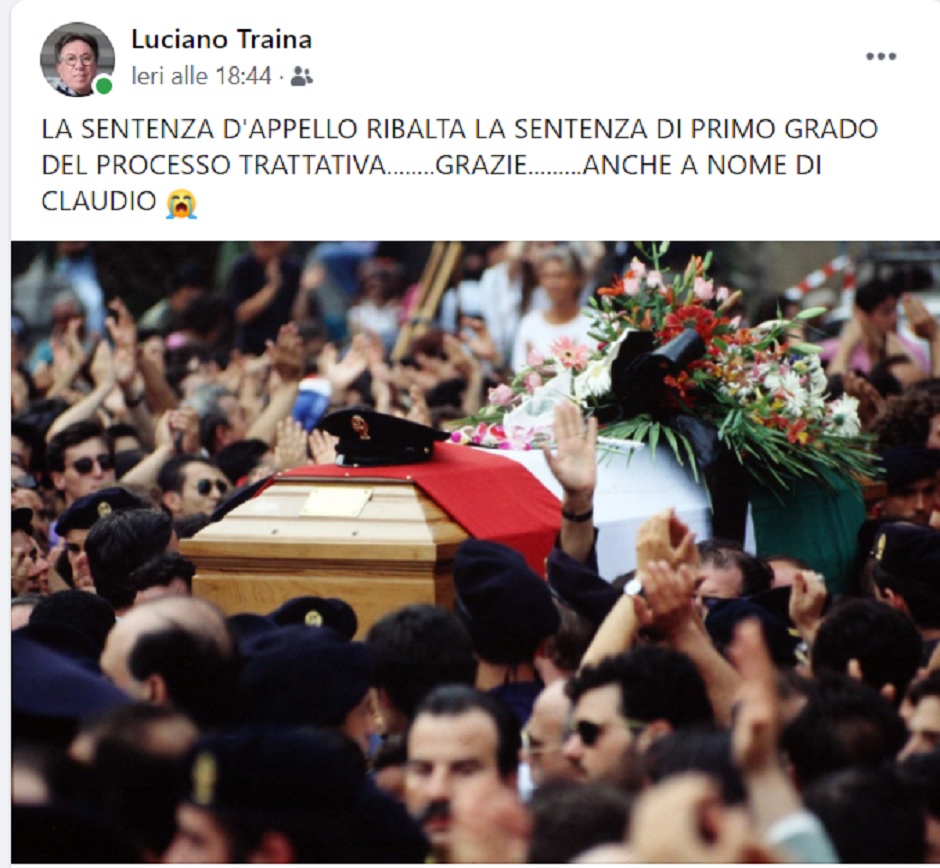 “La sentenza d’appello ribalta la sentenza di primo grado del processo sulla trattativa. Grazie anche a nome di Claudio”. E’ quanto ha scritto su Facebook Luciano Traina, il fratello di uno degli agenti di scorta morti con il giudice Paolo Borsellino il 19 luglio del 1992, dopo la sentenza della corte d’assise d’appello di Palermo che ha assolto i carabinieri Mori, Subranni, De Donno e l’ex senatore Marcello Dell’Utri. Sul suo profilo social Luciano Traina ha postato una foto del funerale. Un commento che ovviamente è ironico e al tempo stesso intriso di tanta amarezza.