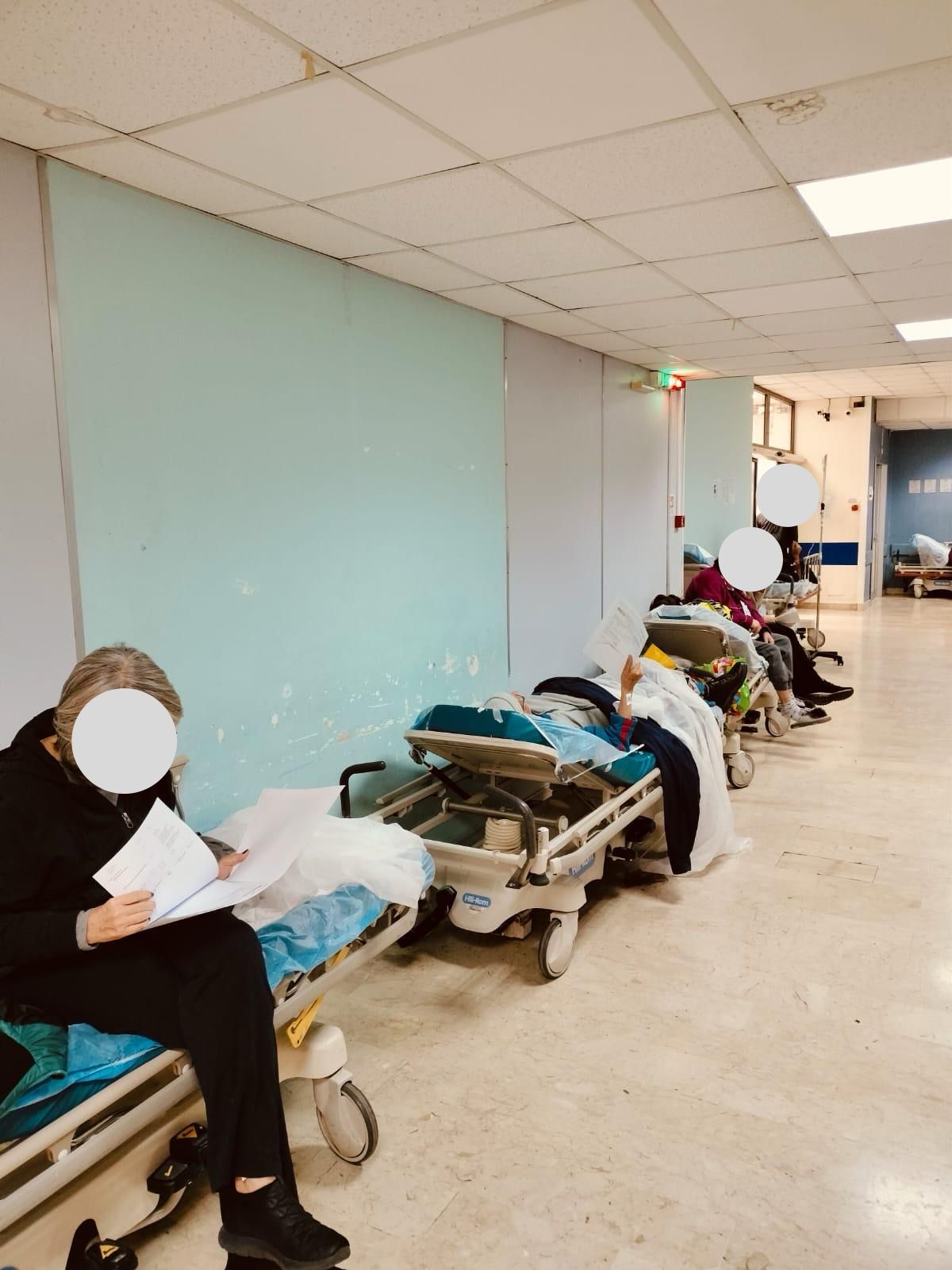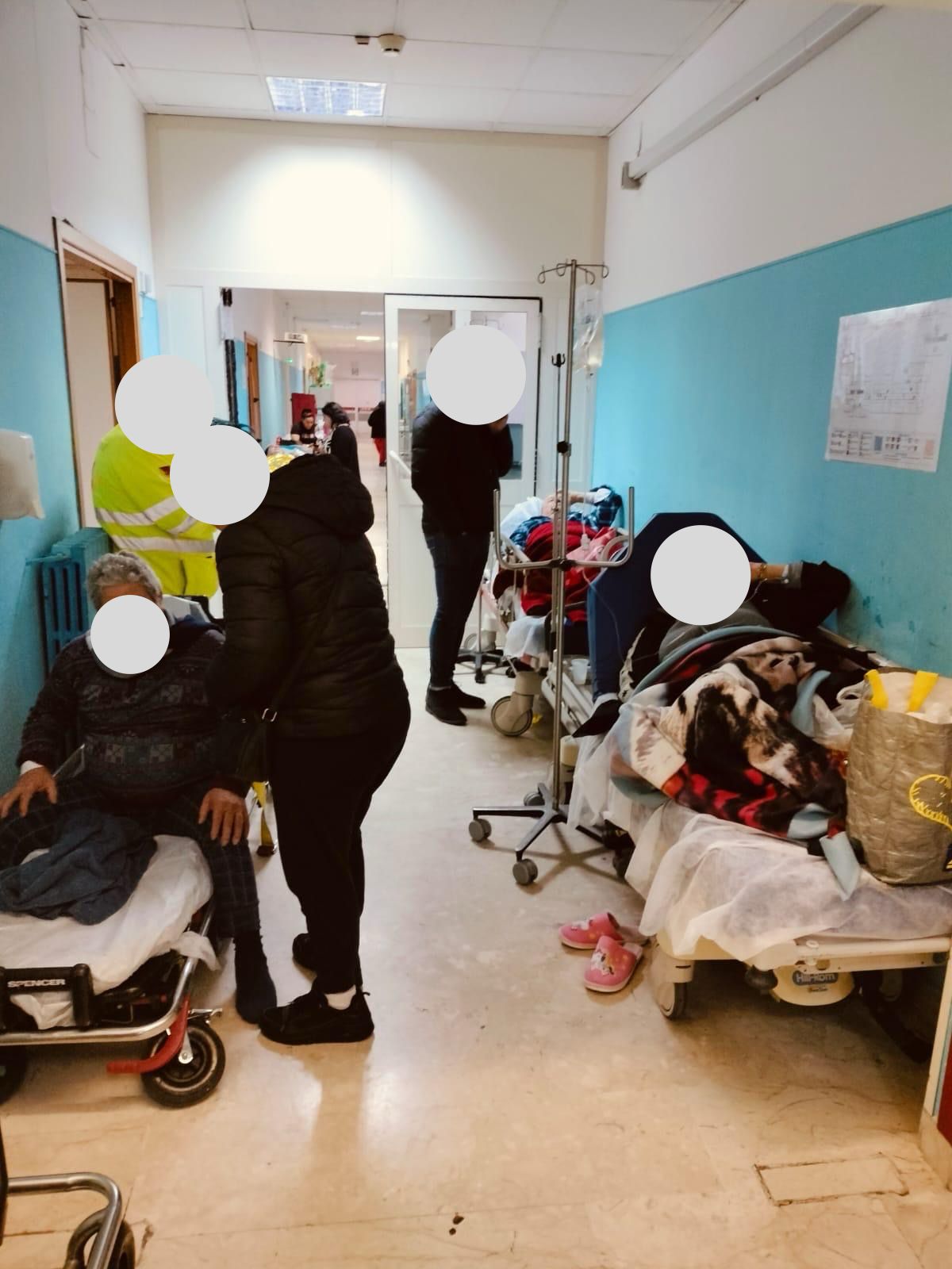“Ci siamo stati ieri mattina e possiamo documentare tutto. In passato c’eravamo stati ma annunciando la visita. I manager che stendono i tappeti rossi al passaggio degli esponenti di governo ci avevano fatto trovare tutto in ordine. Ieri siamo andati senza preavviso ed è emerso il vero volto di un pronto soccorso che, così com’è, andrebbe solamente chiuso. La fila delle barelle inizia da fuori, all’addiaccio, dove sbarcano le ambulanze. Poi continua laddove dovrebbe esserci un monitor col turno degli accessi ed il colore dei codici e invece c’è scritto ‘nessun segnale’. Poi, senza soluzione di continuità prosegue al di là della porta, dove una sottospecie di triage prova a smistare il caos. Tutti i corridoi sono invasi da barelle, tutti, e le poche stanze sono stracolme, non entra nemmeno più uno spillo. Flebo, sacche con le urine spuntano da ogni parte. Sembrano ospedali di un paese in guerra, in piena e continua emergenza in cui i malati arrivano a frotte e non c’è il tempo di badare a tutti. Pazienti che stanno lì, in quelle condizioni, anche per dieci giorni. Ci hanno detto gli infermieri: ‘Non riusciamo a smistarli tra i reparti e le cliniche non sempre li prendono, soprattutto nei periodi in cui hanno esaurito il budget’. E poi il territorio non assorbe nulla, è una gara a dire ‘vai in ospedale’. Hanno tolto le stanze al pronto soccorso per darle al pronto soccorso pediatrico, ci spiegano, in una terribile guerra tra poveri. E presto ci sposteranno in un locale molto più piccolo di questo perché qui inizieranno dei lavori”.