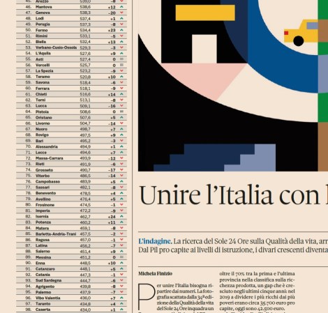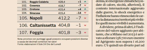 Anche Messina non cambia sempre all’89 esimo posto 451,2 punti. Ma tutte le altre città siciliane, si trovano in fondo alla classifica e perdono posizioni. Palermo ha perso sette posizioni ed è 95esima con 437,9, Agrigento è arretrata di 8 ed è 94esima con 439,8, Catania ha perso una posizione ed è 92esima con 447,3 e Siracusa è sprofondata in coda di 14 posizioni al 104esimo con 415,4, mentre la peggiore è Caltanissetta, penultima in Italia al 106 esimo posto con 404,8.