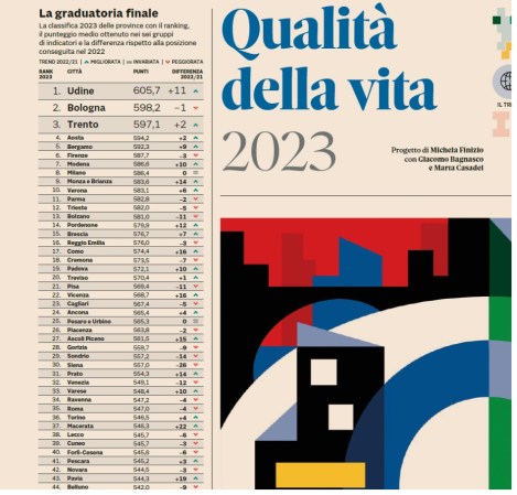 I 90 indicatori statistici alla base dell’indagine, di cui 46 aggiornati al 2022 e 36 al 2023, presentano alcune novità inserite per stare al passo con i cambiamenti sociali in corso l’indice dei progetti finanziati dal Pnrr, l’indice della solitudine, le farmacie, le famiglie con Isee sotto i 7mila euro, il gender pay gap, consumo di farmaci contro l’obesità, lavoratori domestici e l’aumento delle temperature. Dieci gli indici sintetici inclusi nell’indagine che aggregano più parametri (Qualità della vita di giovani, bambini e anziani, Qualità della vita delle donne, Ecosistema urbano, Indice della criminalità, Indice di sportività, Indice del clima, ICity Rank sulle città digitali, composto da Amministrazioni digitali e Città aperte).