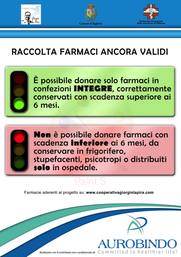 Nei prossimi giorni verrà siglata l’intesa tra il sindaco di Bagheria Patrizio Cinque, il presidente dell’Ordine dei farmacisti della provincia di Palermo, Antonino D’Alessandro, e il presidente della Cooperativa onlus “Giorgio La Pira”, Gianfranco Marotta. «Non è solo un’iniziativa importante contro una forma di spreco» – sottolinea il sindaco Patrizio Cinque – «ma è soprattutto un modo per essere solidali verso la propria comunità accompagnati dalla professionalità e la competenza del settore farmaceutico che garantirà che ciò che sarà distribuito sarà il prodotto più adatto per le necessità dei singoli destinatari».