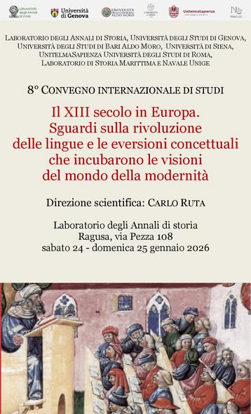 A Ragusa sabato 24 e domenica 25 gennaio 2026 nell’ambito degli eventi storico – culturali organizzati dal Laboratorio degli Annali di Storia di Ragusa, dall’Università degli Studi di Genova, dall’Università degli Studi di Bari “Aldo Moro, dall’Università di Siena, dall’Università degli Studi di Roma – “Unitelma-Sapienza”, dal Laboratorio di Storia Marittima e Navale Fernand Braudel (Università di Genova). Si svolgerà l’evento che rappresenta l’ottavo appuntamento organizzato dal prof. Carlo Ruta e sarà dedicato alla rivoluzione delle lingue nel XIII secolo in Europa.