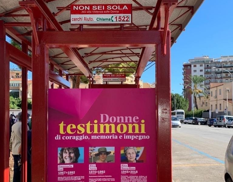 Con una panchina rossa con le indicazioni del 1522 per accogliere le richieste di aiuto e sostegno alle donne contro la violenza maschile, una fontanella, il recupero dell’area verde, un masso simbolo di salda coerente e tenace resistenza. Con i nomi di Rita Borsellino, Maria Pia Lepanto, Agnese Piraino Leto, Emanuela Loi, Rita Àtria incisi su una piccola targa, le donne sono protagoniste, sono il soggetto della richiesta instancabile di giustizia e di verità. E nei pannelli colorati e vivaci della pensilina le loro immagini e le loro storie di vita ci indicano i percorsi di conoscenza e responsabilità, impegno e riconoscenza che ciascuna e ciascuno di noi possiamo condividere.