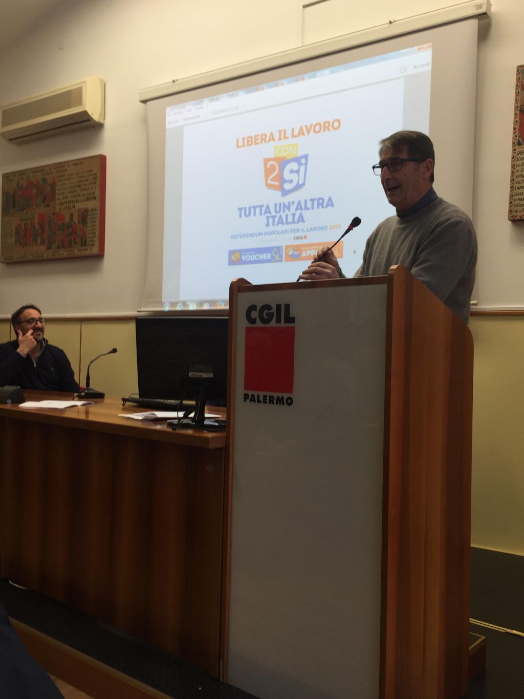 Giornata di informazione-formazione sui referendum sul Lavoro promossi dalla Cgil. Oggi, nella sala della Camera del Lavoro di Palermo, in via Meli, davanti a una platea di dirigenti e rappresentanti sindacali delle categorie, delle Camere del lavoro della provincia, dei servizi, il segretario generale Cgil Palermo Enzo Campo ha dato l’avvio alla campagna elettorale, che entrerà nel vivo con due appuntamenti pubblici che si terranno nel corso del mese. L’11 febbraio si terrà un’iniziativa per coinvolgere il mondo dell’associazionismo diffuso, della cultura, dell’arte, dell’Università e della scuola, dello sport, del mondo religioso.