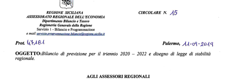 E’ stata, dunque, pubblicata la Circolare dell’assessorato regionale all’economia relativa a “Bilancio di previsione per il triennio 2020-2022 e disegno di legge di stabilità regionale”, firmata dal Vicepresidente ed assessore all’Economia, Gaetano Armao e dal Ragioniere generale, Giovanni Bologna.