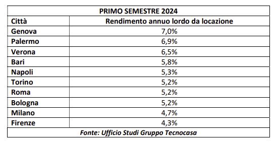 Le città con i rendimenti più alti sono Genova, con un rendimento annuo lordo del 7,0% che è al vertice della classifica; la città offre una combinazione di prezzi accessibili e una forte domanda di affitti, rendendola una scelta ideale per gli investitori. Seguono Palermo con un rendimento del 6,9%, che negli ultimi anni sta sperimentando una rinascita turistica che la rende interessante per chi investe e Verona con un rendimento del 6,5%, città nota per la sua economia dinamica e la sua attrattiva turistica, che garantiscono una domanda costante di affitti.