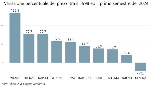 Chi investe nel mattone però oltre al rendimento mira alla rivalutazione dell’immobile e, negli ultimi anni, abbiamo assistito a un recupero dei prezzi. Gli investitori preferiscono le aree con la presenza di atenei, di aziende che attirano lavoratori fuori sede, dotate di servizi e sottoposte ad interventi di riqualificazione. In generale tra le aree che hanno registrato aumenti di prezzi ci sono quelle potenziate con la metropolitana, ad esempio. Dal 1998 al 2024, limitando l’esame alle grandi città italiane risulta una rivalutazione dei prezzi del 48,1%. Quella che si è rivalutata maggiormente è stata Milano con + 135,4%, seguita da Napoli e Firenze con + 77,1%.