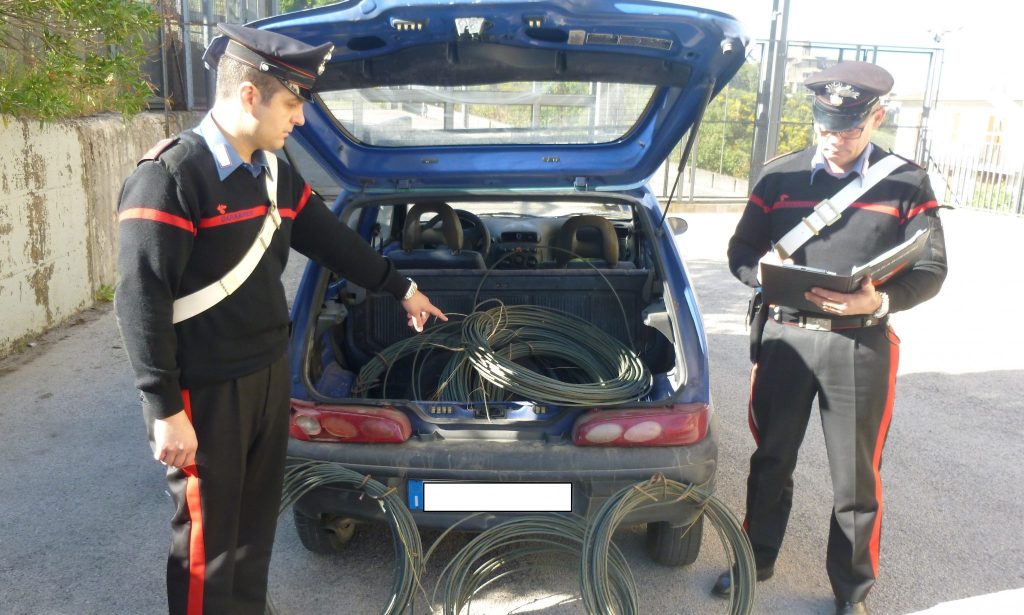 I militari hanno fermato Di Mauro e Lo Presti nella campagne di Petralia Sottana (Pa), in contrada Landro, a bordo di un’autovettura Fiat 600 con 15 bobine di cavi di rame asportati poco prima dalla rete Enel.