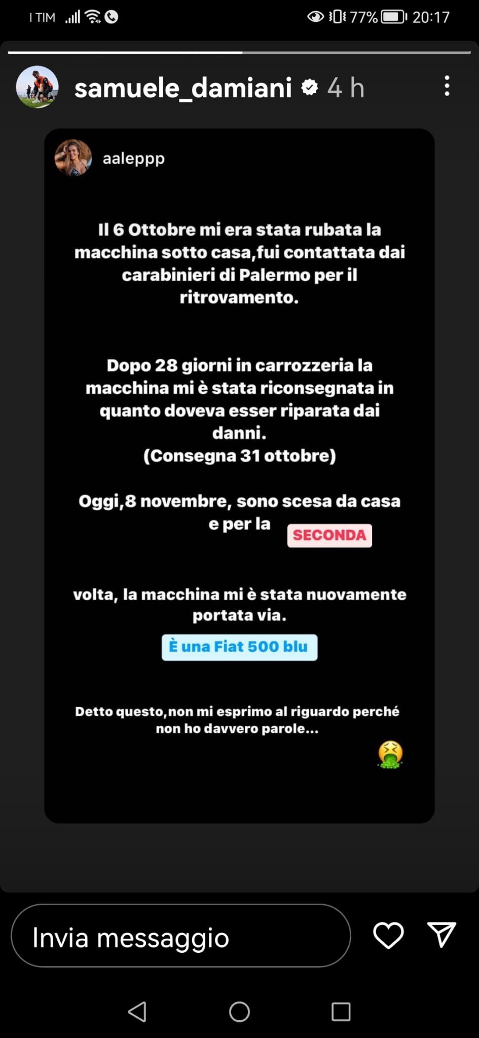 Attraverso il proprio profilo Instagram, poi rimbalzato sul profilo del calciatore rosanero, lo sfogo di Alessia: “Il 6 ottobre mi era stata rubata la macchina sotto casa, fui contattata dai carabinieri di Palermo per il ritrovamento. Dopo 28 giorni in carrozzeria, la macchina mi è stata riconsegnata in quanto doveva essere riparata dai danni (consegna 31 ottobre). Oggi, 8 novembre, sono scesa da casa e per la seconda volta la macchina mi è stata nuovamente portata via. È una Fiat 500 blu. Detto questo, non mi esprimo al riguardo perché non davvero parole”.