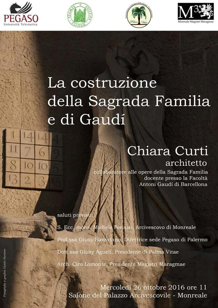 L’incontro del 26 ottobre si svolgerà alle 11 a Monreale, nel salone del Palazzo Arcivescovile alla presenza dell’Arcivescovo S.E. Mons. Michele Pennisi. L’architetto Chiara Curti parlerà de “La costruzione della Sagrada Familia e di Gaudì”. Con l’ausilio di immagini e documenti , sarà raccontata l’eccezionalità del cantiere della cattedrale dove, lo stesso Gaudì, nel modellare il Tempio Espiatorio, si è lasciato “modellare” da quel progetto ambizioso che continua nel tempo a forgiare anima e materia.