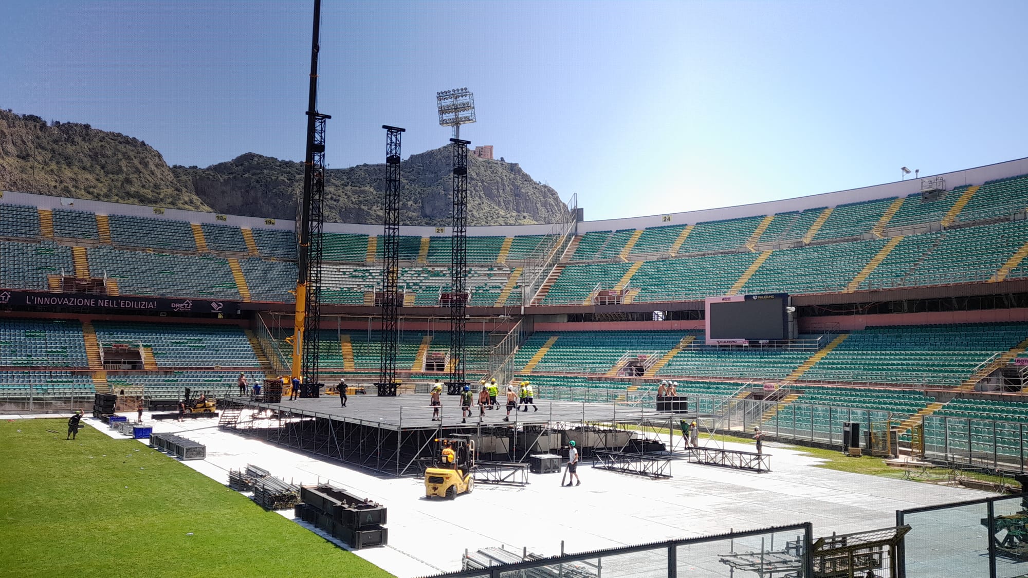 Via ai preparativi per preparare il palco dello stadio Renzo Barbera. Le operazioni di assembramento della struttura sono iniziate oggi e termineranno nella giornata di lunedì pomeriggio. Poi subentrerà la squadra che si occuperà della scenografia, che dovrebbe completare gli abbellimenti finali in un paio di giorni. Un evento per il quale è atteso un afflusso di circa 74.000 persone, di cui buona parte (circa 55.000 spettatori) arriveranno da fuori città. Un evento a cui il Comune si sta preparando con un apposito piano traffico e che avrà sicuramente un impatto economico notevole per il comparto alberghiero e della ristorazione.