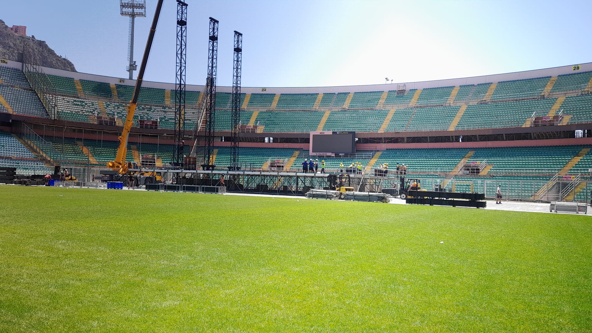 Il palco sarà posizionato sotto la Curva Sud e sarà largo circa cinquanta metri, estendendosi invece per venti metri in lunghezza. A spiegare lo stato dell’arte dei lavori è Carmelo Costa, esponente di Musica da Bere ed organizzatore dell’evento musicale. “Abbiamo cominciato le operazioni di montaggio questa mattina. Ieri abbiamo preparato l’area, mettendo dei pannelli per proteggere il prato. Adesso stiamo cominciando a assemblare il palco, con l’aiuto di una gru. Si lavorerà incessantemente per far si che sia tutto pronto per l’evento di giovedì prossimo. Data per la quale aspettiamo le prime 37.000 persone e, il giorno dopo, ne attendiamo altre 37.000, per un totale di 74.000 persone. Un numero superiore ad ogni record qui in Sicilia“.