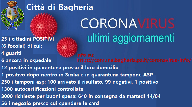 Sono 25 i cittadini bagheresi positivi al coronavirus. Di questi 4 sono quelli completamente guariti, tra i quali i due fratellini di 18 e 3 mesi, 6 sono ancora ricoverati in ospedale, 12 invece sono positivi ma sono a casa perché stanno discretamente bene, 2 sono coloro che, guariti, si trovano in strutture messe a disposizione dalla Regione Siciliana, in attesa di poter tornare a casa e uno è l’unico trovato positivo dopo il tampone tra quelli che erano in quarantena al rientro in Sicilia.