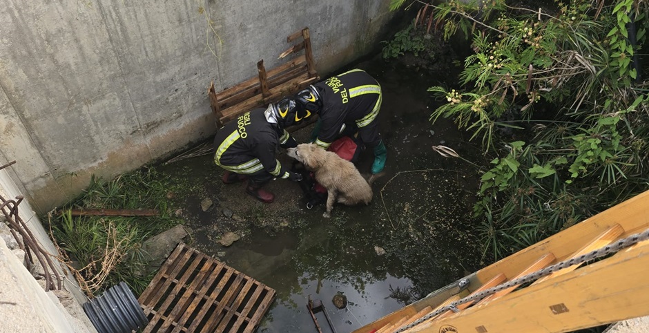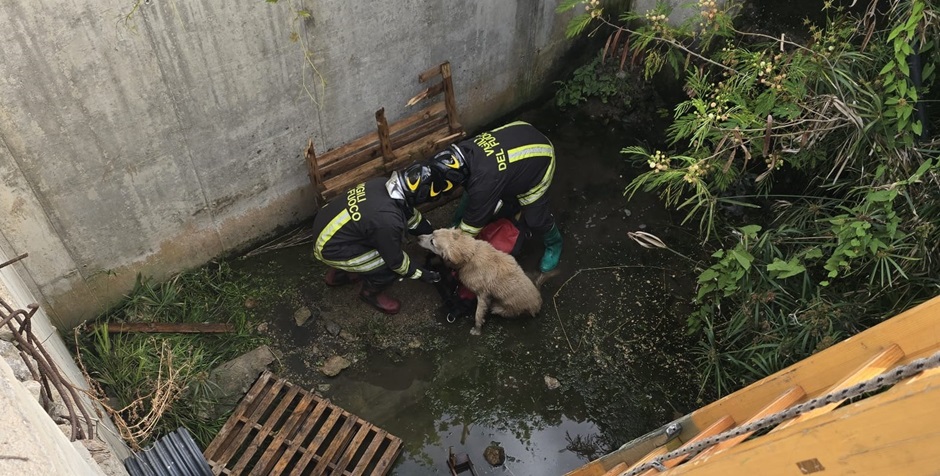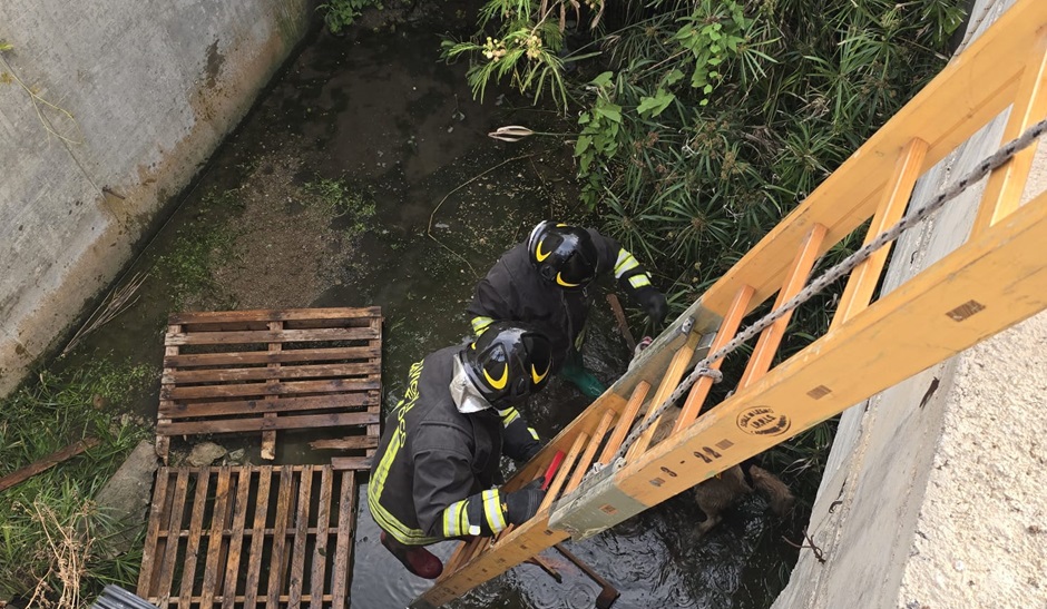 La polizia municipale di Campofelice di Roccella con il comandante Agostino Di Maggio e l’ispettore Margherita Velardo insieme ai vigili del fuoco di Cefalù hanno salvato due cani di grossa taglia finiti dentro un canalone alto circa 4 metri.