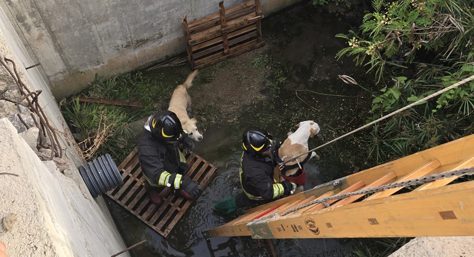 La polizia municipale di Campofelice di Roccella con il comandante Agostino Di Maggio e l’ispettore Margherita Velardo insieme ai vigili del fuoco di Cefalù hanno salvato due cani di grossa taglia finiti dentro un canalone alto circa 4 metri.