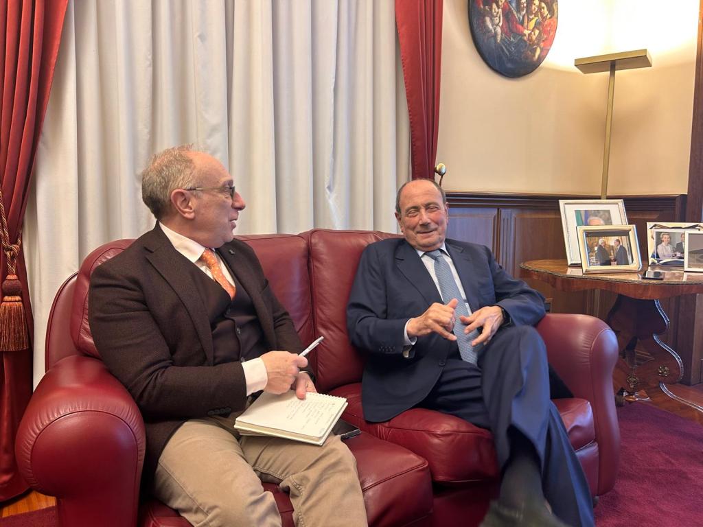 Una chiacchierata informale e cordiale con un presidente sorridente e motivato, interrotta solo dal tintinnio del lampadario che annuncia, da lì a poco, una telefonata del capo della Protezione civile siciliana: “C’è stato un terremoto”. Qualche minuto che per accertarsi che non ci siano danni consistenti e poi si continua, ma sempre con l’attenzione rivolta all’evolversi della situazione. La scia sismica continuerà, sappiamo adesso, ma senza particolari danni.