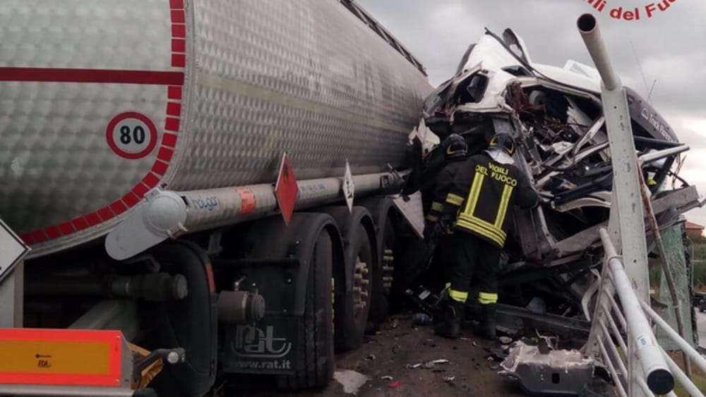 Per cause in corso di accertamento, un’autocisterna e un’autovettura sono entrate in collisione in un tratto a doppio senso di circolazione.