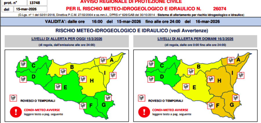 Il bollettino diffuso nel pomeriggio dalla Protezione civile parla di rischio idrogeologico ed idraulico per la Sicilia Orientale  con conseguente allerta è di colore arancione. L’allerta diventa gialla invece nelle zone centrali dell’isola e scende a verde nella fascia occidentale dove oggi è stata gialla.