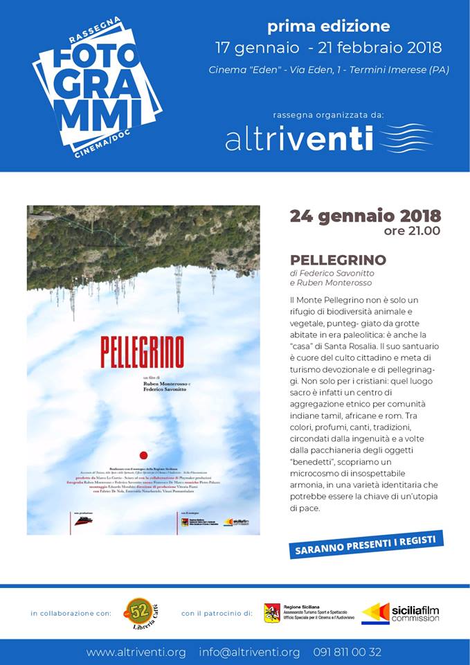 Dopo il “buona la prima!” della scorsa settimana si continua con il secondo appuntamento di Fotogrammi – Cinema/Doc, rassegna di cinema documentario ideata e promossa dall’associazione Culturale Altriventi. Questa sera alle 21 al Cinema Eden di Termini Imerese, si prosegue con “Pellegrino” di Ruben Monterosso e Federico Savonitto. Una produzione Sciara srl con il sostegno dell’Ufficio Speciale per il Cinema e l’Audiovisivo/Sicilia Film Commission che opera all’interno dell’Assessorato al Turismo, Sport e Spettacolo della Regione Siciliana.