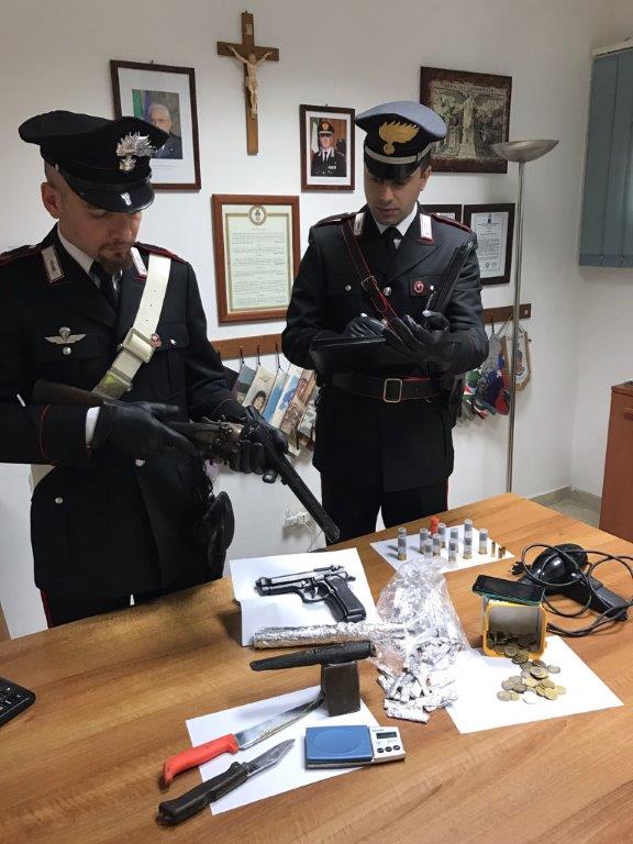 In un magazzino utilizzato dal sedicenne i carabinieri hanno trovato hashish e marijuana, una doppietta calibro 12 (lupara) con matricola abrasa, una pistola senza tappo rosso.