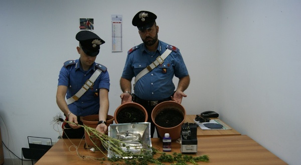 L’evidente tentativo di disfarsi dello stupefacente, non è andato a buon fine, infatti in una stanza adibita a serra indoor sono stati trovati 3 vasi ed una lampada da 600 watt ed un trasformatore, mentre le 3 piante di marijuana (lunghe 110 cm, 100 cm e 30 cm) erano state spiantate e schiacciate tra la finestra e la persiana esterna.