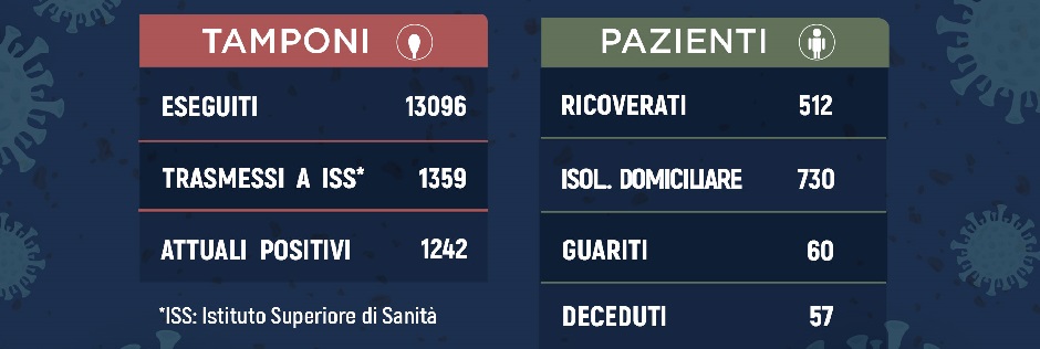 Sono ricoverati 512 pazienti (+12 rispetto a ieri), di cui 71 in terapia intensiva (-4), mentre 730 (+62) sono in isolamento domiciliare, 60 guariti (+7) e 57 deceduti (+18, ma riferito agli ultimi due giorni).