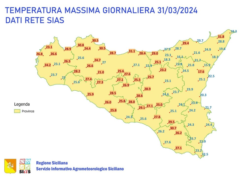 Il massimo valore di 31,8 °C sulla rete Sias è stato registrato dalla stazione Torregrotta (Me), che ha superato il massimo valore mensile precedente di 30,9 °C registrato il 22 marzo 2016; in quella occasione fu registrato il massimo valore assoluto di marzo dell’intera rete SIAS, 32,1 °C, che questa volta non è stato invece superato”.