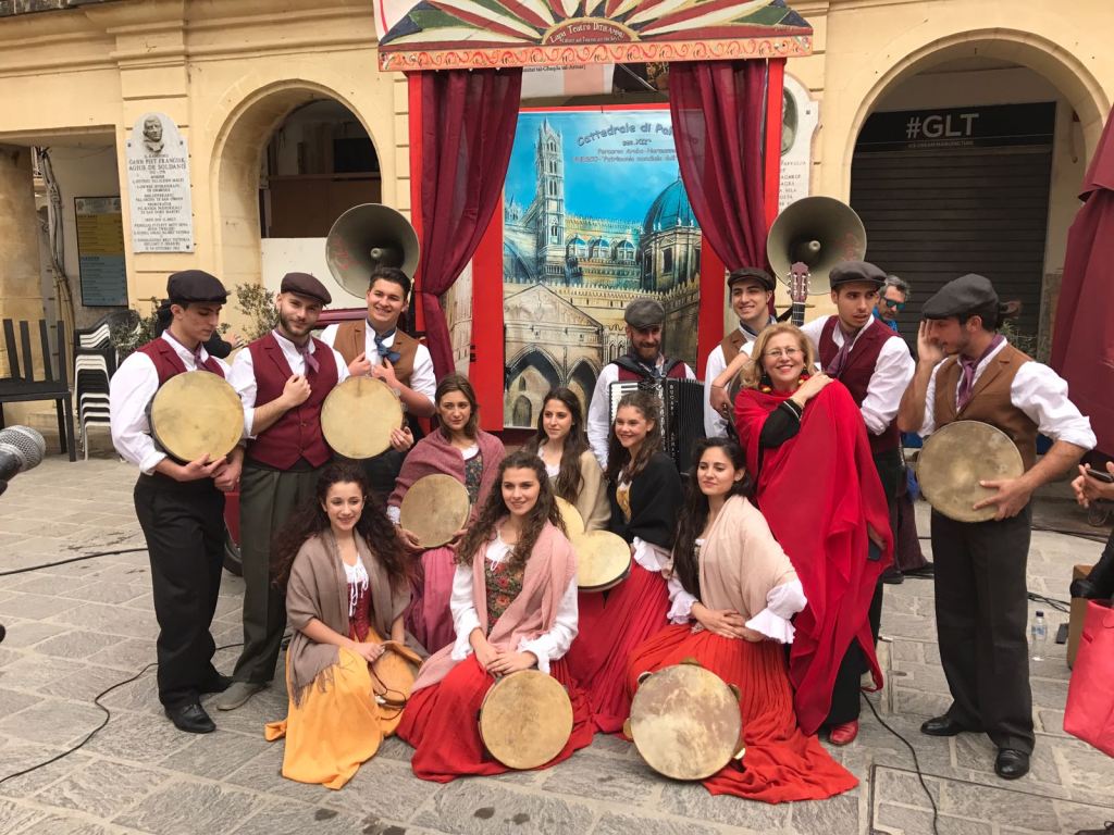 Le ragazze dalle ampie gonne colorate e i lunghi capelli sciolti e i ragazzi con gilet e coppola sul capo, dentro un teatro montato in piazza, con tanto di siparietto, hanno intonato le musiche siciliane e coinvolto gli spettatori.