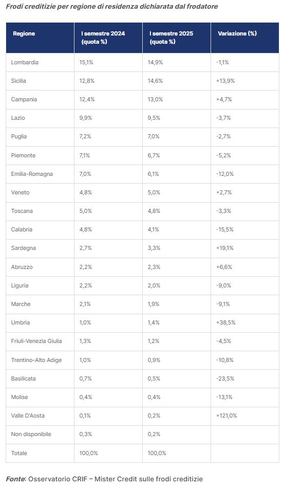 Le frodi creditizie basate sul furto di identità continuano a rappresentare una minaccia preoccupante per il settore finanziario, con particolare impatto sul credito al consumo. “Secondo l’ultima analisi dell’Osservatorio Crif, nel primo semestre 2025, si registra un aumento pari al 13,9% – afferma Gabriele Urzì dirigente nazionale Fabi e responsabile salute e sicurezza Fabi Palermo. La Sicilia, rapportando il numero dei casi al credito erogato nelle singole regioni, è al primo posto seguita da Campania e Calabria e al secondo posto, dopo la Lombardia per numero di casi segnalati. Non parliamo solo di numeri, ma di una vera e propria emergenza sociale che colpisce famiglie, lavoratori e imprese. Il furto d’identità e le tecniche sempre più sofisticate utilizzate dai truffatori stanno minando la fiducia nel sistema creditizio e aggravando la vulnerabilità economica di migliaia di cittadini. Questa deriva va denunciata con fermezza e richiede interventi strutturali: maggiore controllo sulle procedure di concessione del credito, investimenti nella sicurezza digitale, e campagne di informazione capillare rivolte alla cittadinanza. È inaccettabile che la nostra regione, già penalizzata da una cronica difficoltà di accesso al credito, debba ora fare i conti anche con il primato negativo delle frodi.”