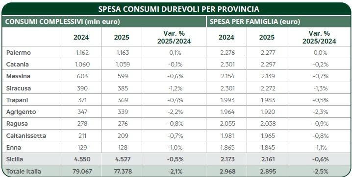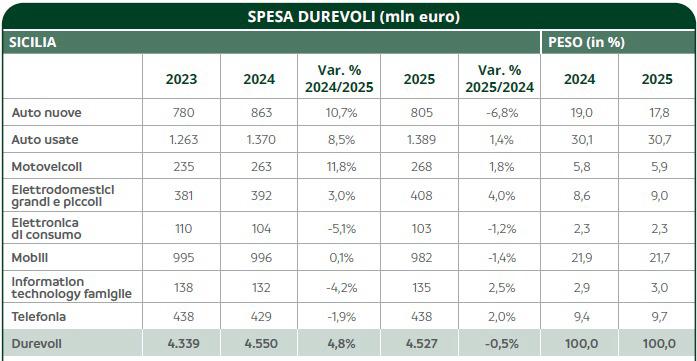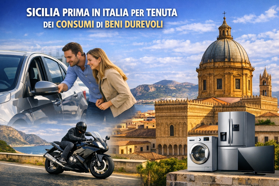 Nel 2025 in Sicilia sono stati spesi 4 miliardi e 527 milioni di euro in beni durevoli (8° regione in Italia), lo 0,5% in meno rispetto all’anno prima: un risultato migliore rispetto al Mezzogiorno (-1,6% di media), alla media nazionale (-2,1%) e alla tendenza di tutte le altre 19 regioni italiane. I dati, elaborati dall’Osservatorio Annuale Consumi di Findomestic giunto alla sua 32ª edizione, mostrano come la regione abbia attenuato la contrazione grazie alla crescita di alcuni segmenti — in particolare motocicli (+1,8%), auto usate (+1,4%) ed elettrodomestici (+4%) — mentre il calo delle auto nuove (-6,8%) e la debolezza di elettronica di consumo e mobili continuano a pesare sul risultato complessivo.