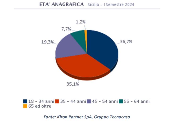 L’età media di chi ha sottoscritto un mutuo in Sicilia nel primo semestre 2024 è 39,4 anni. L’analisi per fasce d’età mostra che il 36,7% della popolazione ricade nella fascia più bassa, 18 – 34 anni; il 35,1% ha un’età compresa tra 35 e 44 anni; il 19,3% ricade nei 45 – 54 anni; il 7,7% si colloca nella fascia 55 – 64 anni; l’1,2% ricade nella fascia più alta, 65 ed oltre.