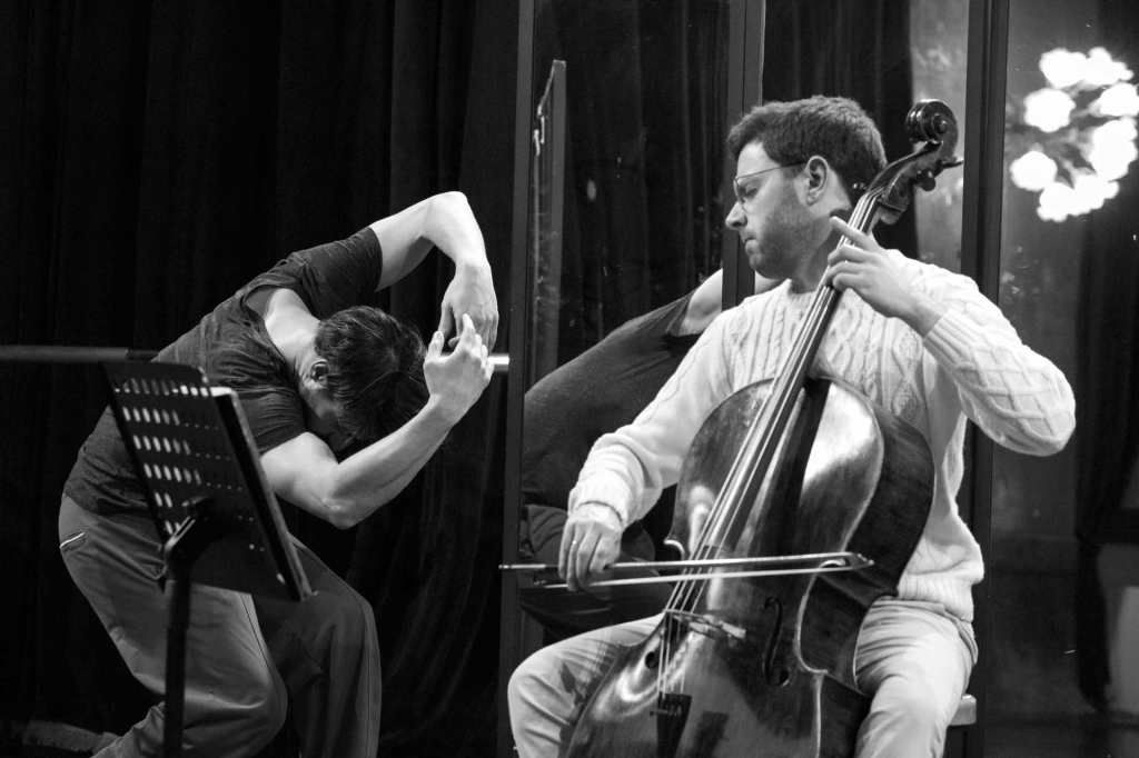 Signs: i segni del corpo e i segni musicali in un serrato dialogo a due fra arti sorelle. Uno scambio di intenti dove la musica diventa gesto e il gesto diventa fiato. Un gesto da ascoltare, un suono da vedere. Il programma musicale per violoncello solo che fornirà lo spunto a questo intenso dialogo spazia dal Settecento fino alla musica contemporanea: alcuni movimenti dalle prime tre Suites per violoncello solo di Johann Sebastian Bach 1685-1750), il Capriccio in Do minore di Giuseppe Maria Dall’Abaco (1710-1805), Nepdalfele da Signs, Games and Messages di György Kurtág (n. 1926) e, in prima esecuzione assoluta, Quasi una sarabanda di Orazio Sciortino, pianista e compositore siracusano nato nel 1984.