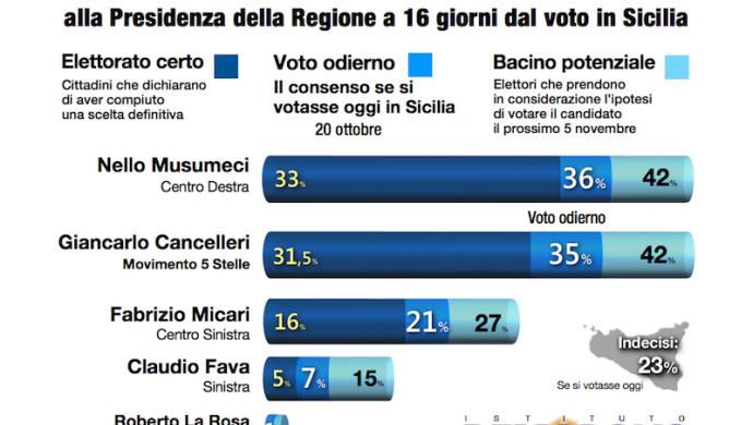 Se si votasse oggi per la Presidenza della Regione, il candidato del Centro Destra Nello Musumeci, con il 36%, avrebbe oggi un lieve vantaggio sul leader del Movimento 5 stelle in Sicilia Giancarlo Cancelleri, attestato al 35%.
