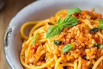Gli ingredienti per la nostra spaghettata vegana sono: un cavolfiore, una cipolla, due carote, due cucchiai di concentrato di pomodoro, 400 g di polpa di pomodoro, due cucchiai di erbe provenzali, Olio extravergine di oliva q.b., Sale e pepe, Basilico fresco. E’ consentita anche una spolverata di parmigiano.