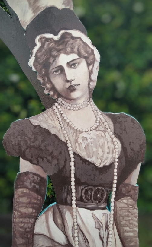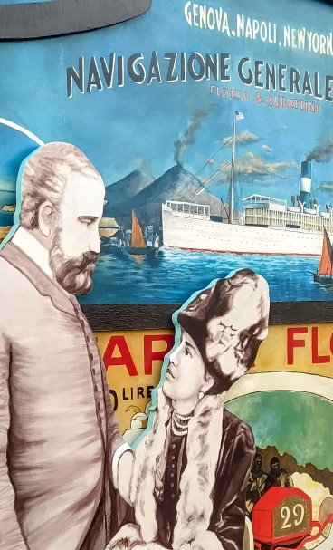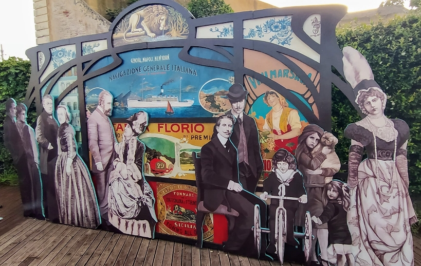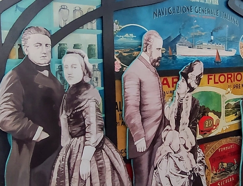 L’installazione, che misura 2.5 mt per 5 mt, autonoma e removibile, è composta da vari pannelli in compensato che rappresentano i protagonisti dell’epopea dei Florio da Paolo e Ignazio, capostipiti della famiglia a Franca ed Ignazio ultimi rappresentanti, posti innanzi una parete incorniciata con raffigurazioni dei manifesti delle loro attività commerciali più fruttuose, dall’aromateria alla flotta navale alla targa Florio alle cantine Florio al tonno e alla ceramica. L’attività, realizzata presso i locali del liceo artistico Catalano nel corso dell’anno scolastico 23-24 iniziata a fine aprile 2024 e terminata la prima settimana di giugno 2024, ha coinvolto le classi 3F 3L 4F 4Ce 5F 5I. I docenti, Nicola Busacca, Rosalia La Grutta, Antonella Ragusa, Massimo Sanfilippo e gli assistenti tecnici Antonella Modica e Salvatore Giacalone hanno guidato gli studenti in un percorso di studio della famiglia Florio accompagnati anche dall’affascinante racconto, per immagini e parole, della docente Lietta Valvo Grimaldi, autrice di “L’avventura dei Florio… per ragazzi” (Ed..Caracoli). Le sagome della famiglia Florio sono state realizzate scala 1:1 e rappresentate attraverso la pittura acrilica con effetti monocromi seppiati in riferimento alle fonti fotografiche storiche della famiglia. Particolare attenzione è stata data , vista l’importanza del sito sttoposto alla tutela della Soprintendenza ai Beni Culturali della Regione Sicilia e tra i beni da visitare nell’ambito di “Le vie dei tesori” , anche al dialogo tra lo spazio da decorare e il manufatto architettonico esistente.