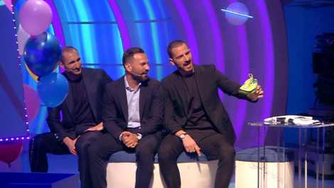 E compaiono in studio Bonucci e Chiellini che hanno subito regalato uno scarpino. Bonucci sottolinea il fatto che si trattasse “solo del sinistro. Continua: “Il destro che più bello te lo vieni a prendere a Torino durante una partita”.