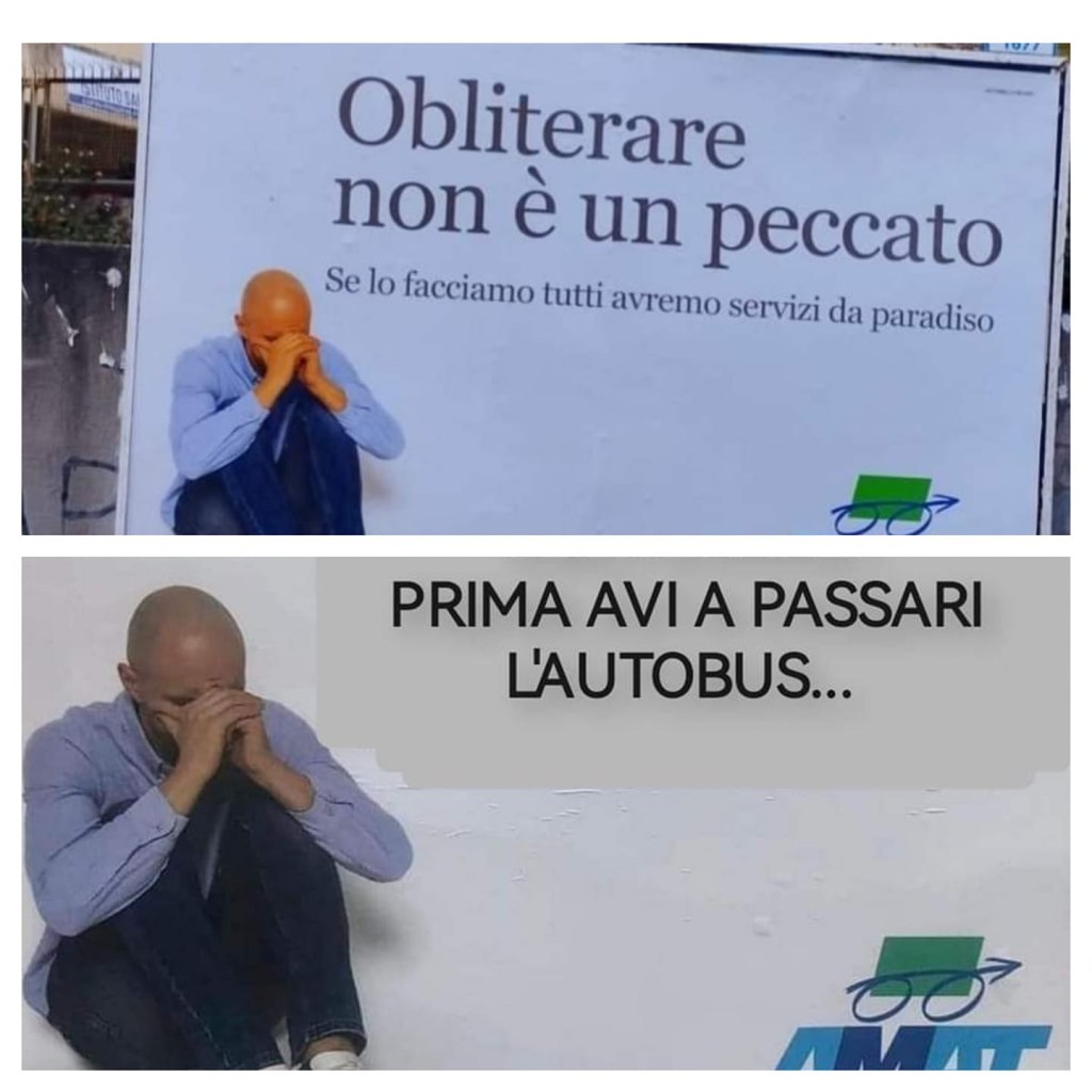 La campagna pubblicitaria prevede inserzioni sui giornali on line e affissione di cartellonistica. Due i messaggi utilizzati entrambi dedicati all’obliterazione dei biglietti. Il primo problema, infatti, sono le corse non pagate. In tanti acquistano il biglietto ma lo validano solo se sale il controllore. I messaggi sono due: nel primo un palermitano quasi disperato accompagnato dalla scritta “obliterare non è peccato” mentre il secondo vede lo stesso Palermitano riflettere sull’onestà che insegna al figlio ma che non mette in pratica ‘rubando’ di fatto la corsa sull’autobus. La sospensione riguarderà, naturalmente, l’on line ma difficilmente potrà riguardare la cartellonistica visto che i manifesti sono ormai affissi.