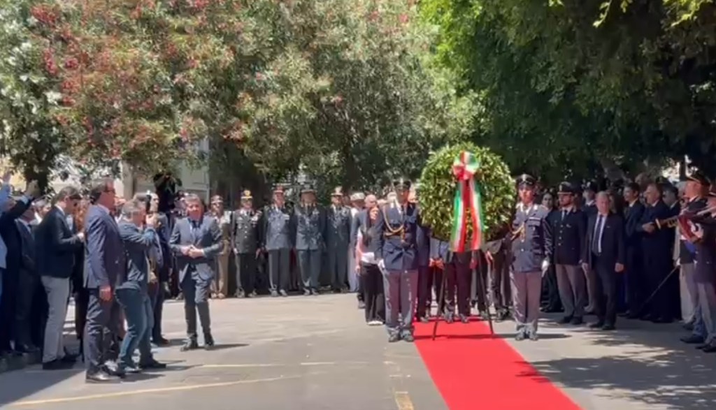 Il ministro dell’Interno Matteo Piantedosi e il capo della polizia Vittorio Pisani hanno deposto una corona d’alloro al reparto Scorte alla caserma Lungaro di Palermo.