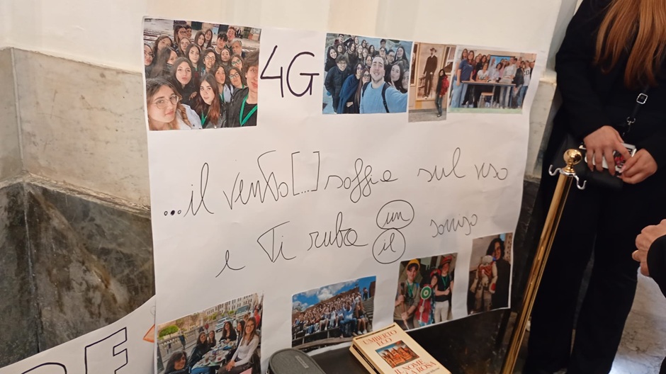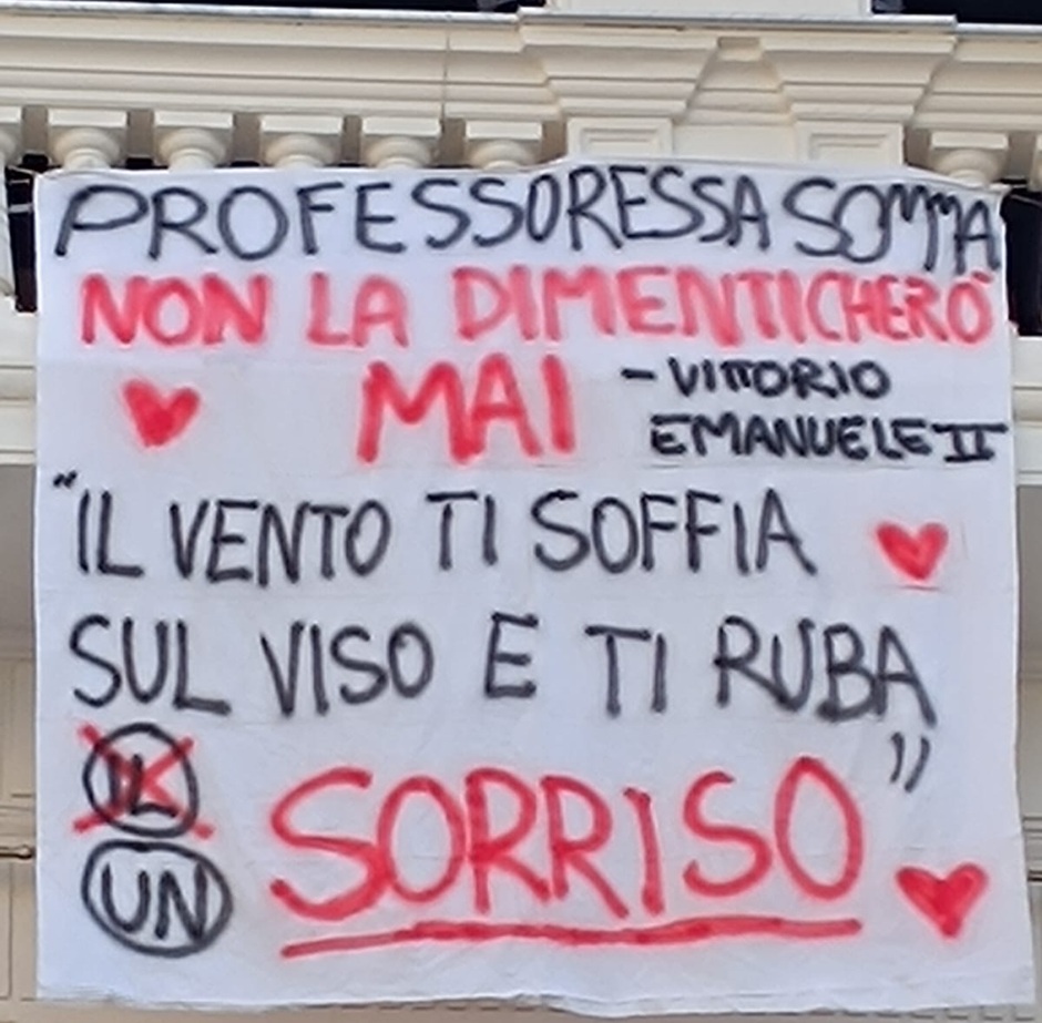 Presente anche un rappresentante della comunità di Sant’Egidio per testimoniare il contributo dato all’associazione da parte di Giovanna Somma. I ragazzi hanno voluto ricordare con uno striscione appeso nel balcone del liceo e con un cartellone in chiesa l’ultima frase che l’insegnante aveva scritto sulla lavagna prima di morire. Una strofa della canzone di Rino Gaetano A mano a mano. “Il vento soffia sul viso e ti ruba un sorriso”.