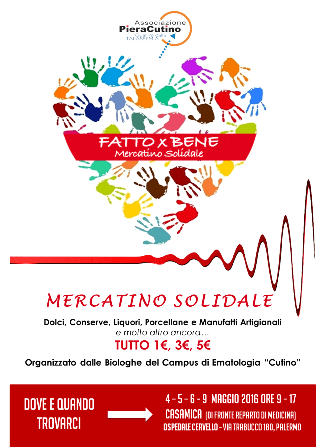 Il mercatino sarà aperto dal 4 al 6 maggio e poi lunedì 9 maggio dalle 9 alle 17. Fatto per Bene rientra nel programma di iniziative promosse dall’Associazione Cutino e dall’Azienda Villa Sofia-Cervello per il Thalassemia Day, che vedrà tutta una serie di eventi nel mese di maggio per favorire la prevenzione e la raccolta fondi per la cura e la ricerca della talassemia.
