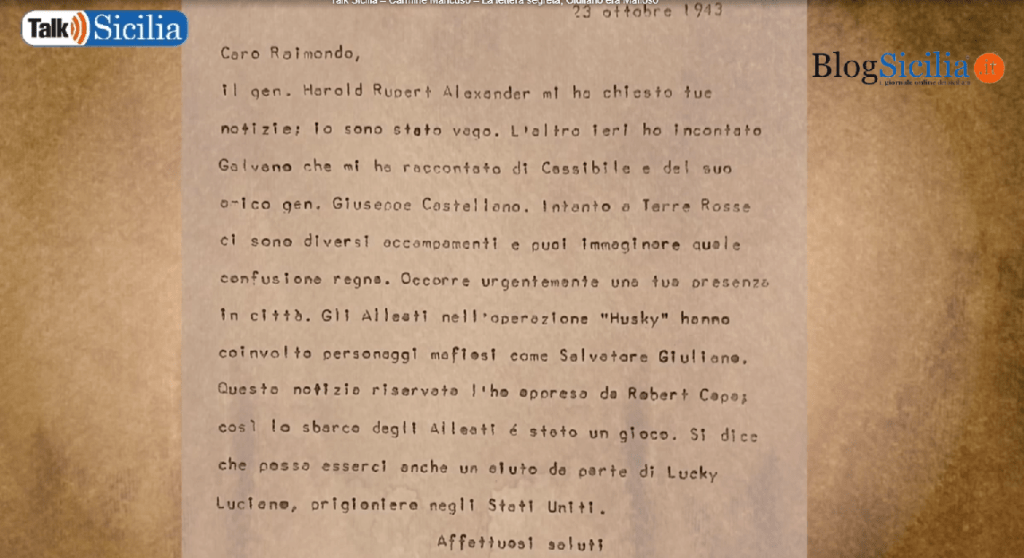 Salvatore Giuliano sarebbe stato affiliato alla mafia. E’ scritto nero su bianco su una lettera di quasi ottanta anni fa. Il documento è stato ritrovato da Carmine Mancuso, ex senatore della Repubblica e oggi presidente dell’Associazione Vittime dimenticate di mafia. A Talk Sicilia, Mancuso ha mostrato per la prima volta questo documento sinora inedito.