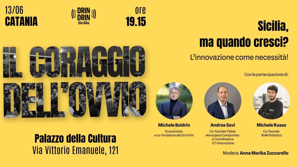 In un tessuto economico statico e a bassa produttività, l’innovazione non è un lusso: è una necessità sistemica. La tappa catanese del tour nazionale Il Coraggio dell’Ovvio, promosso dall’associazione Drin Drin, punta i riflettori sulla possibilità concreta di costruire in Sicilia un ecosistema imprenditoriale capace di crescere, competere e trattenere talento.