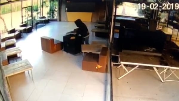 Jeans e bomber nero col cappuccio, l’uomo ha tentato di portare via una delle casse del locale e anche alcune attrezzature.