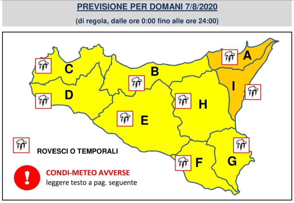 Allerta meteo arancione per domani a Catania, gialla per tutto il resto della Sicilia. Previste precipitazioni intense e a carattere di rovescio o temporali con grandinate e forti raffiche di vento, nella giornata di domani venerdì 7 agosto, diramato dalla Sala Operativa Regionale della Protezione Civile Regionale, che prevede un livello di allerta arancione anche nella zona di Catania. L’amministrazione comunale invita i cittadini alla massima prudenza, richiamandosi alle raccomandazioni diffuse dalla Protezione Civile e vale a dire: