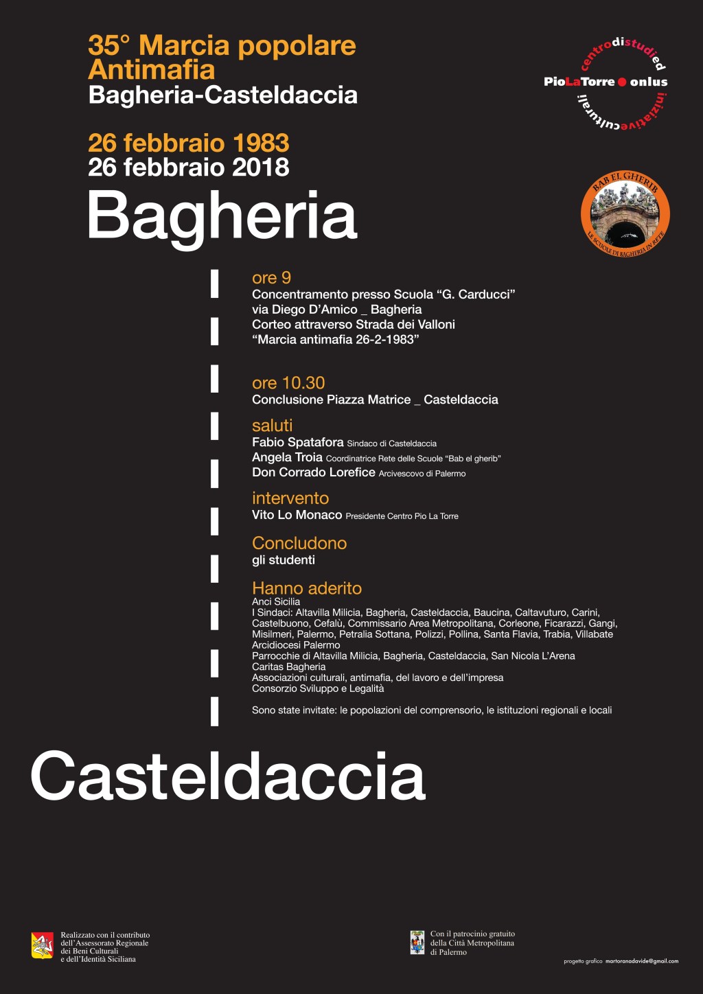Il Centro Pio La Torre e la rete delle scuole di Bagheria Bab el Gherib promuovono il 35° anniversario della prima marcia popolare Bagheria-Casteldaccia ripetendone il percorso lunedì 26 febbraio 2018.
