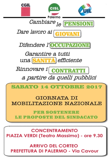 E’ una piattaforma che punta al rilancio, alla crescita e al benessere dei lavoratori, dei pensionati, dei giovani, delle famiglie in difficoltà, quella che porteranno in piazza domani Cgil Cisl Uil anche a Palermo, come in tutte le città italiane. Alle 9,30 il concentramento del corteo che si muoverà da piazza Verdi per raggiungere la sede della Prefettura in via Cavour, dove i sindacati presenteranno al Prefetto, le richieste rivolte al Governo nazionale sui provvedimenti da inserire nella prossima legge di stabilità.