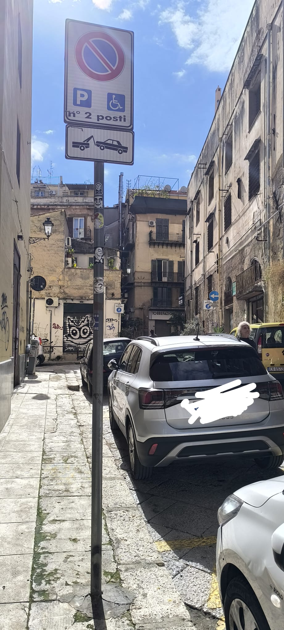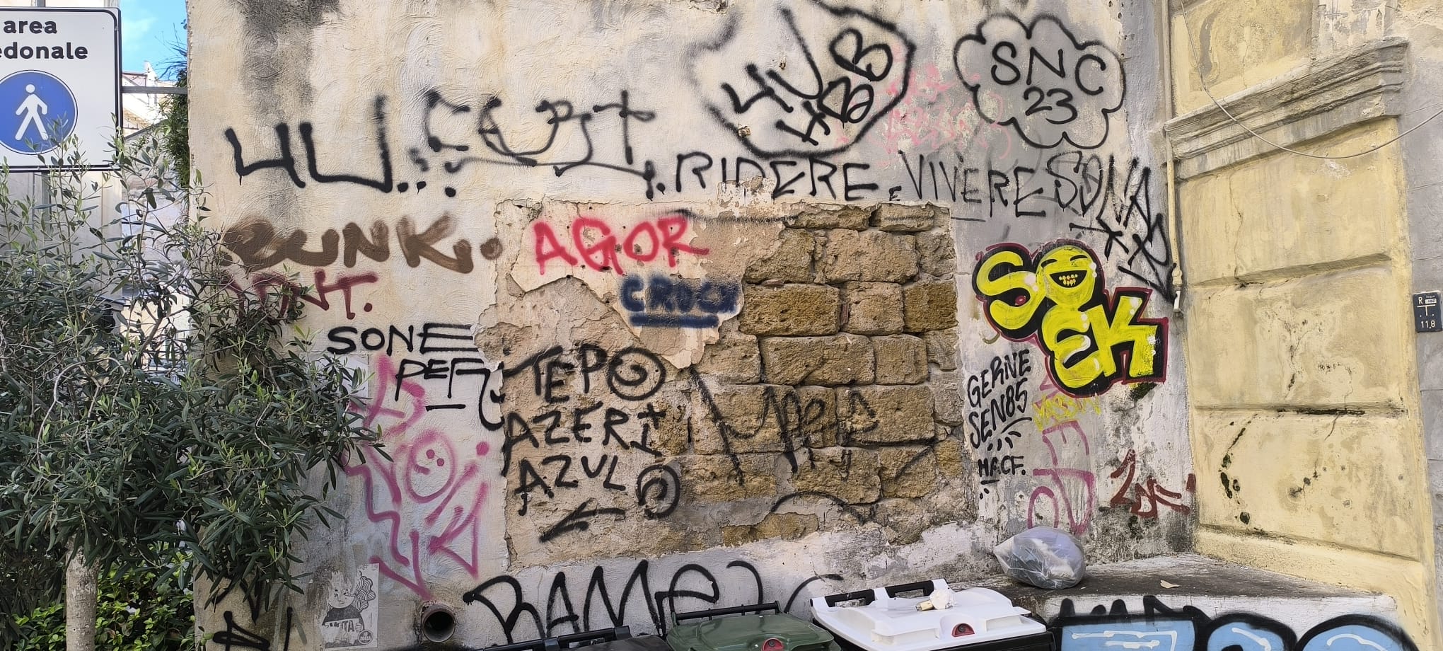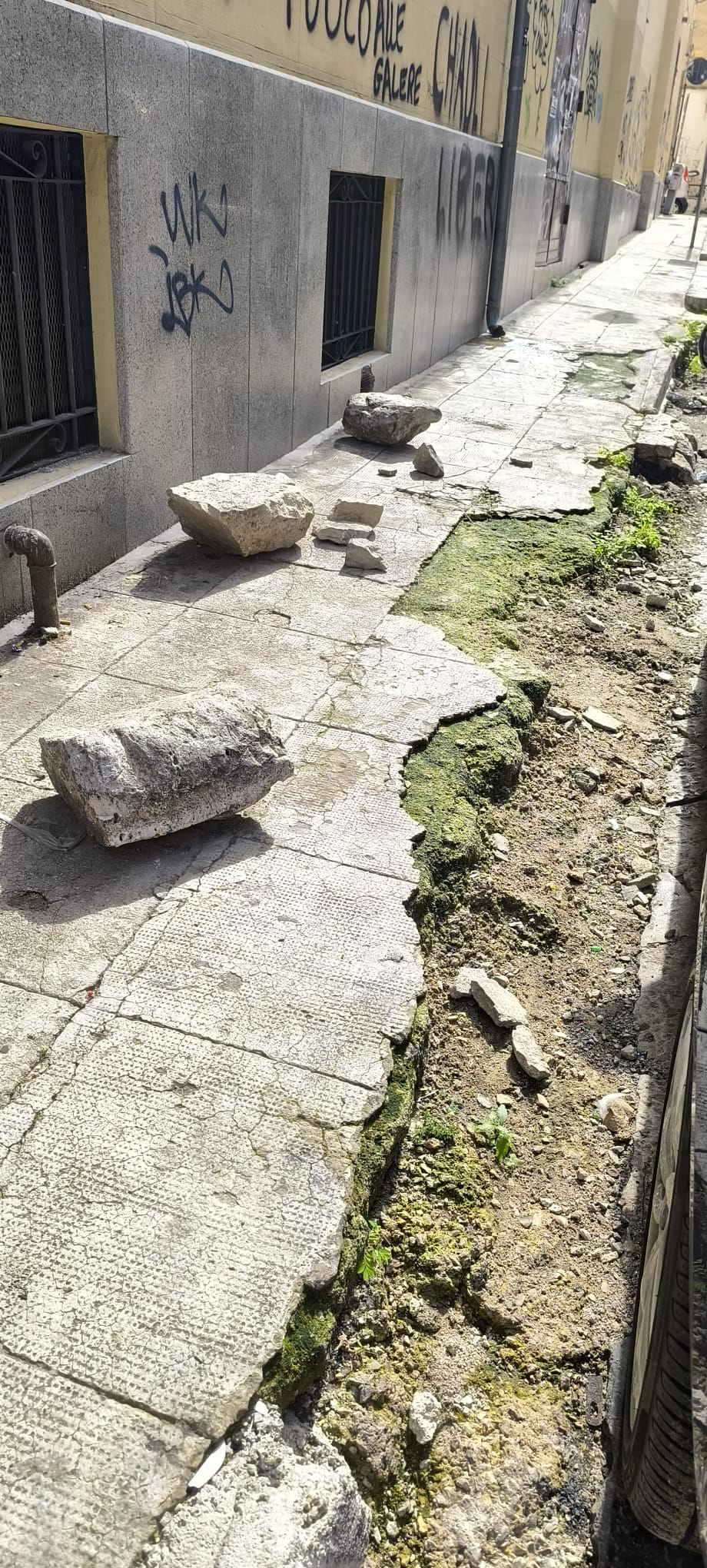 Purtroppo il degrado si estende a tutta l’area circostante, popolata giornalmente da centinaia e centinaia di turisti e residenti, con marciapiedi dissestati, macchine parcheggiate nei posti riservati ai disabili senza alcun pass autorizzativo, materassi abbandonati e alcune pietre poggiate su parti in restauro molto pericolose e prive di qualsiasi dispositivo di sicurezza. Fanno bella vista anche vistose scritte di vario tipo sui muri e recinzioni di plastica senza peraltro alcuna indicazione chiara (a parte un laconico cartello di cantiere) che spieghi chiaramente i lavori in corso di realizzzazione. e, almeno ieri, totale assenza di controlli.